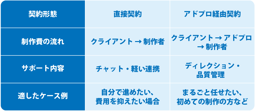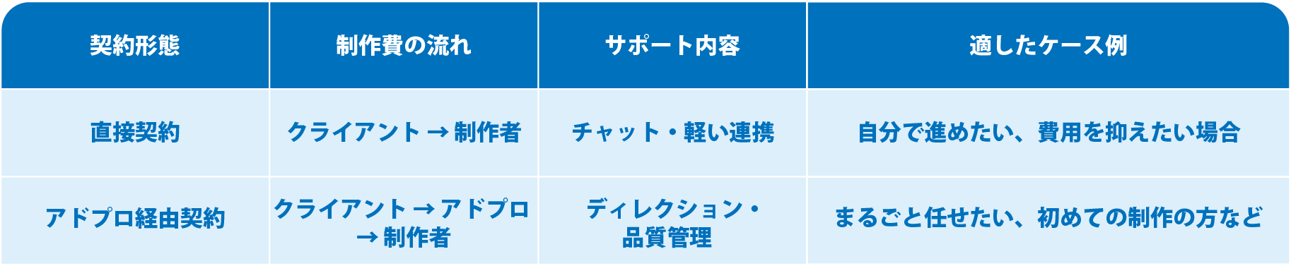 アドプロ経由:ディレクションや進行管理をアド・プロモートが担当。品質や納期に不安がある場合はこちらが安心です。制作費の10~50%が手数料として発生します。